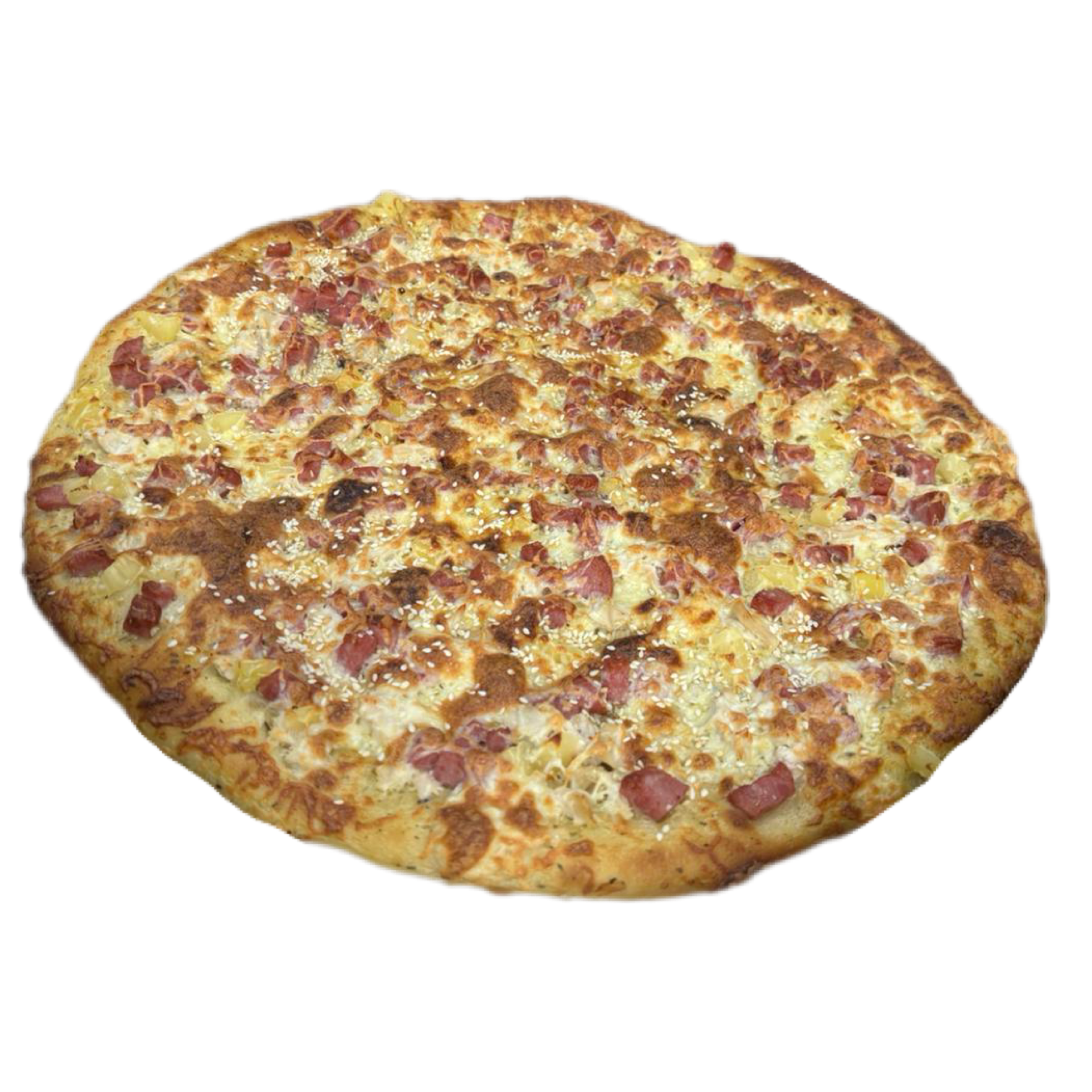 Состав: курица, ветчина, ананас консервированный, помидор, кунжут, сыр, томатный соус.